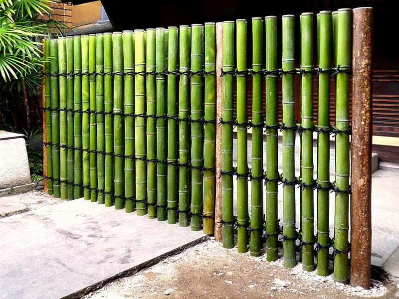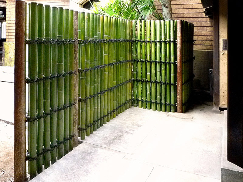 この垣は、胴縁に対して、縦の竹材を交互に配置するという独特の構造を持っています。竪子が一列に並ぶのではなく、手前と奥に交互に配置されることで、見る角度によって奥行きとリズムが感じられ、透け感のある軽やかな印象を与えるのが魅力です。