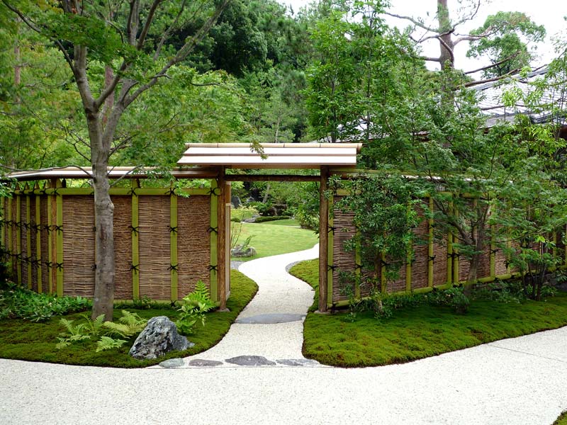 桂垣は、細い竹穂を芯材とし、その表面に少し太めの竹の枝を横方向に配し、さらに押縁に丸竹の二つ割りをかけて仕上げる、表裏のない竹垣です。構造の複雑さと手間のかかる細工から、高級感のある格式高い垣として知られています。