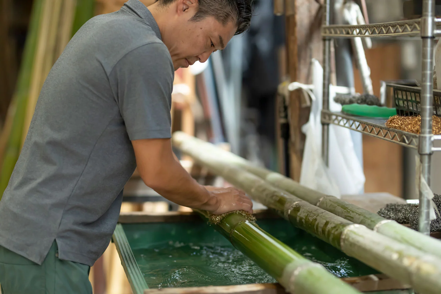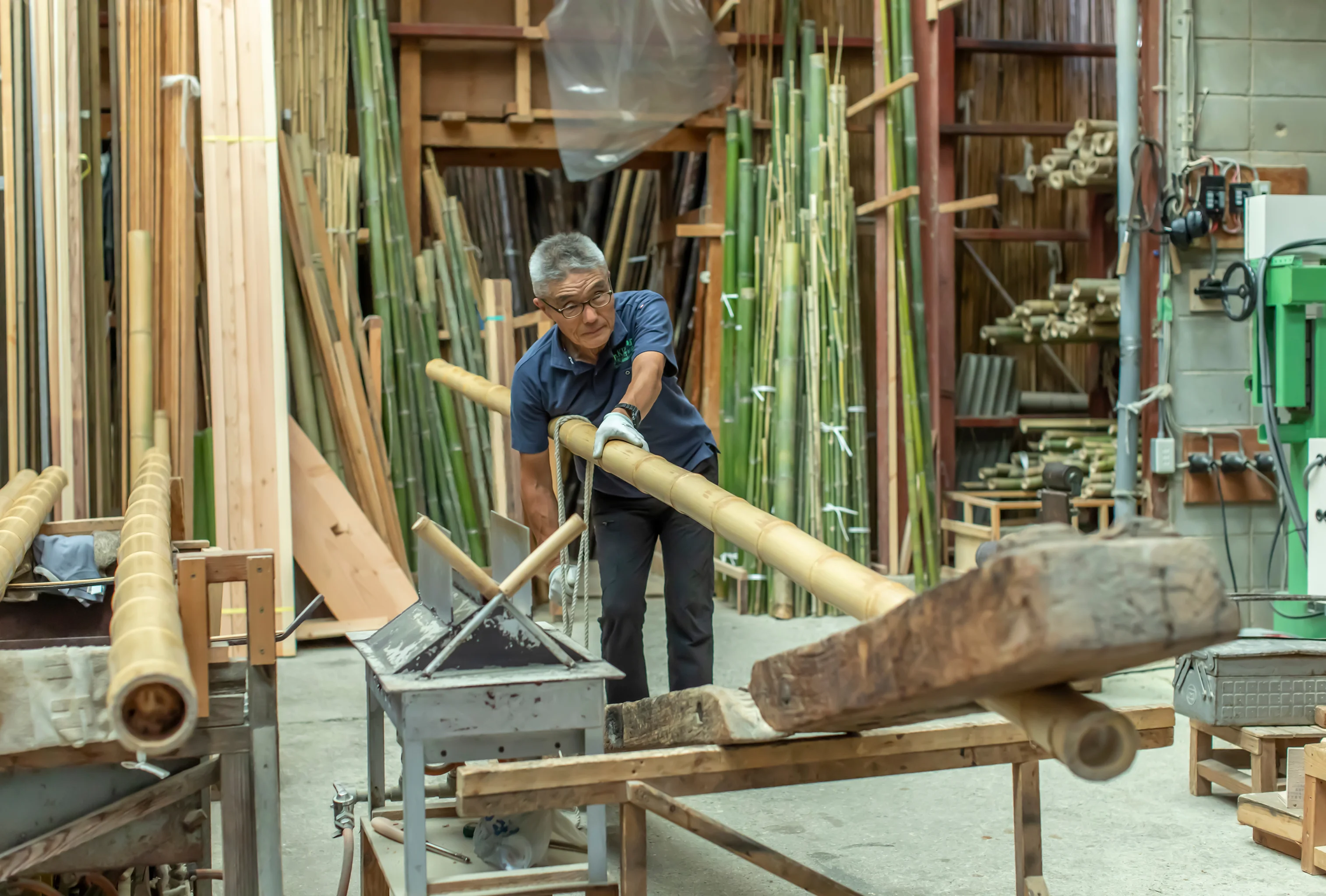 山に囲まれた京都の寒暖差が良質な竹を育み、この環境と職人の熟練した技術が出会うことで、京銘竹という特別な素材が生まれます。自然の竹を職人が丁寧に加工し、独特の色合いや質感を持つ美しい建材へと変化させるのです。