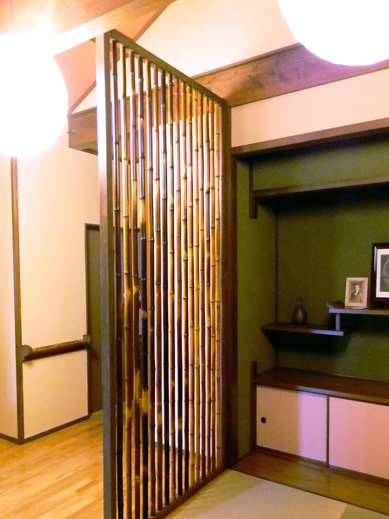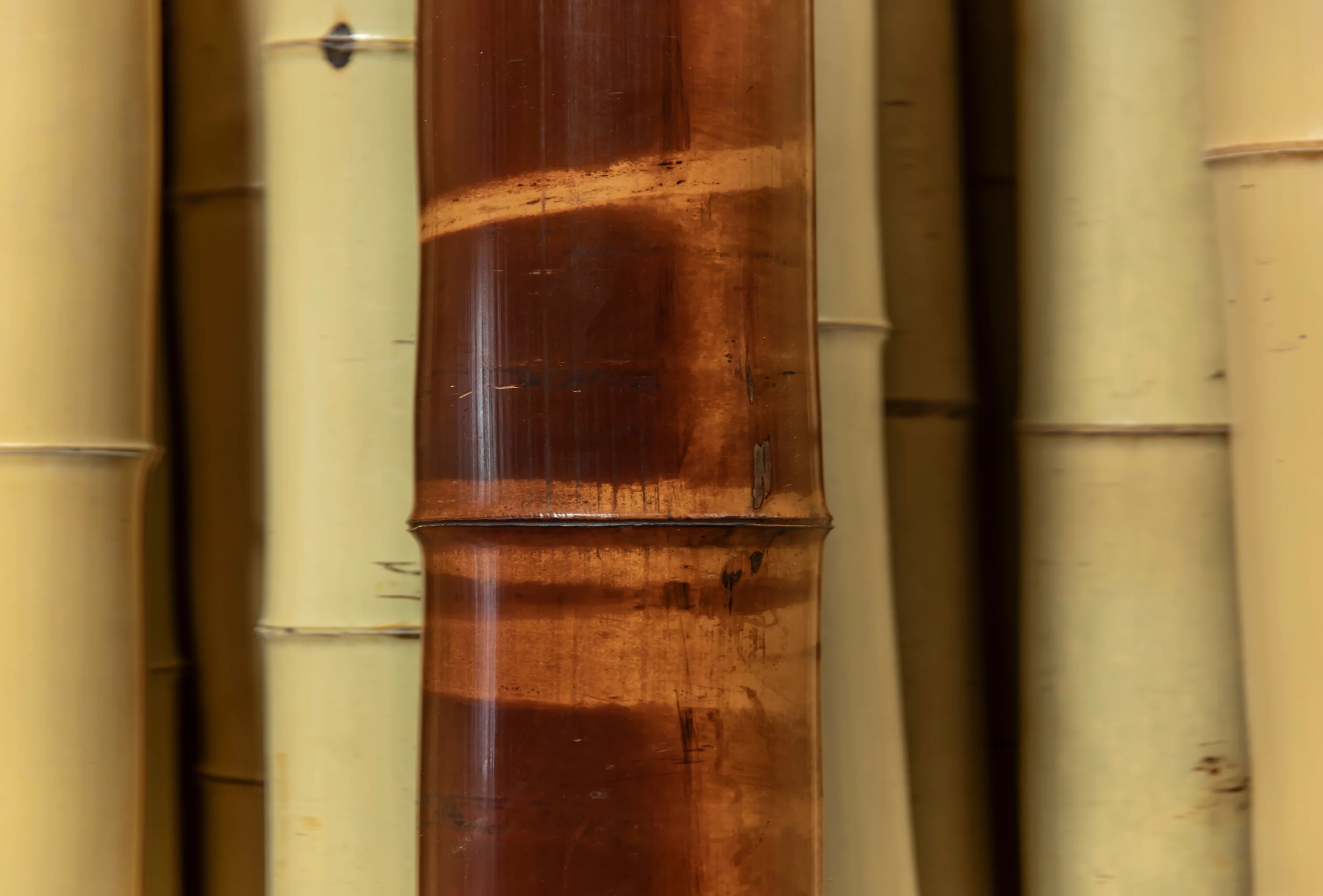 煤竹の魅力は、その一様でない表情にあります。黒の濃淡や艶、模様の違いは、単なる装飾ではなく、その竹が置かれていた環境や時間を映し出す痕跡です。煤竹を取り入れるということは、単に古材を使うということではなく、そこに宿る暮らしの記憶や文化の層を、空間にそっと引き込む行為でもあるのです。