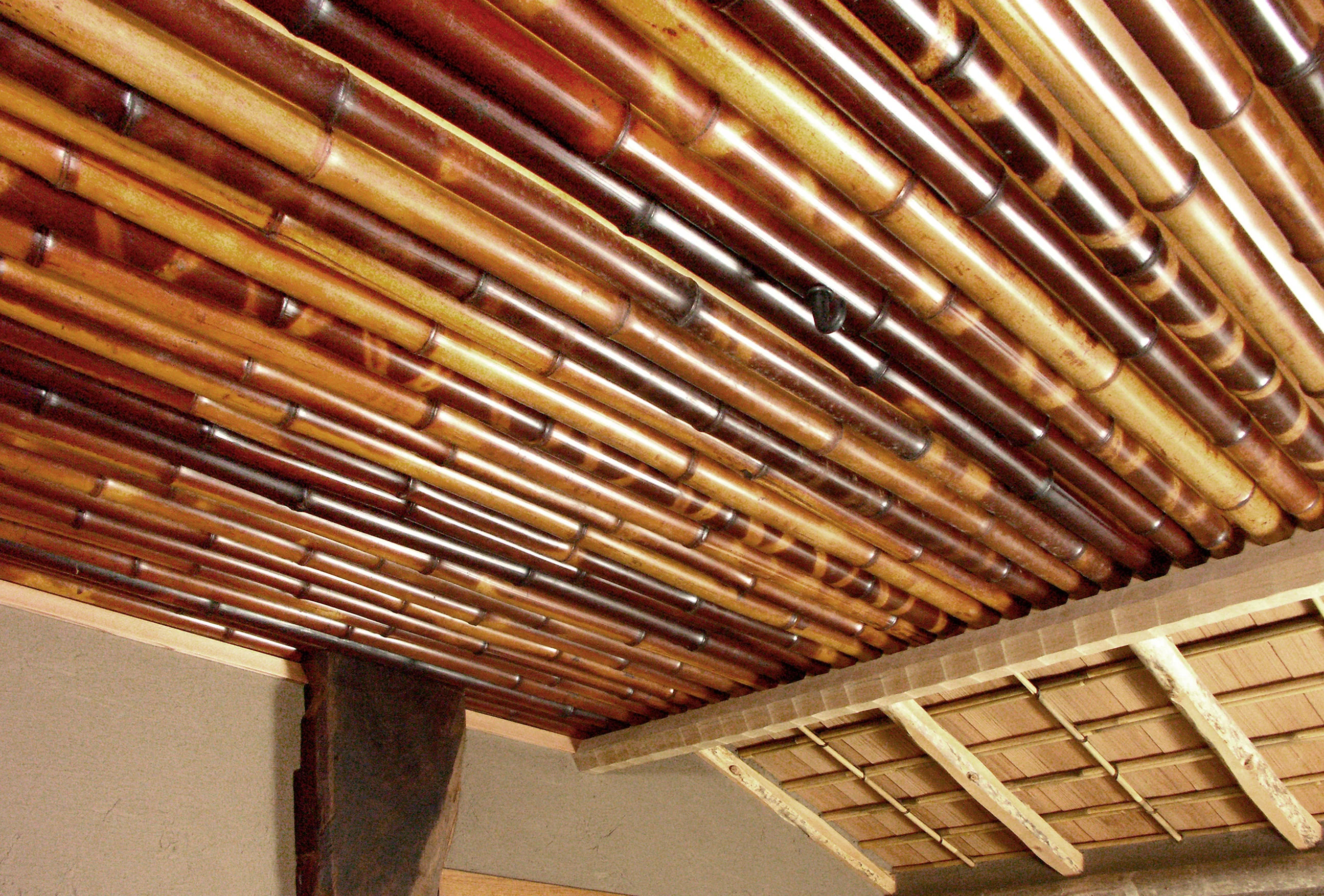 囲炉裏のある生活が日常だった時代、竹は茅葺き屋根の素材として使われてきました。その竹に、長い年月をかけて煙が染み込み、表面には自然な炭素の層が形成されます。