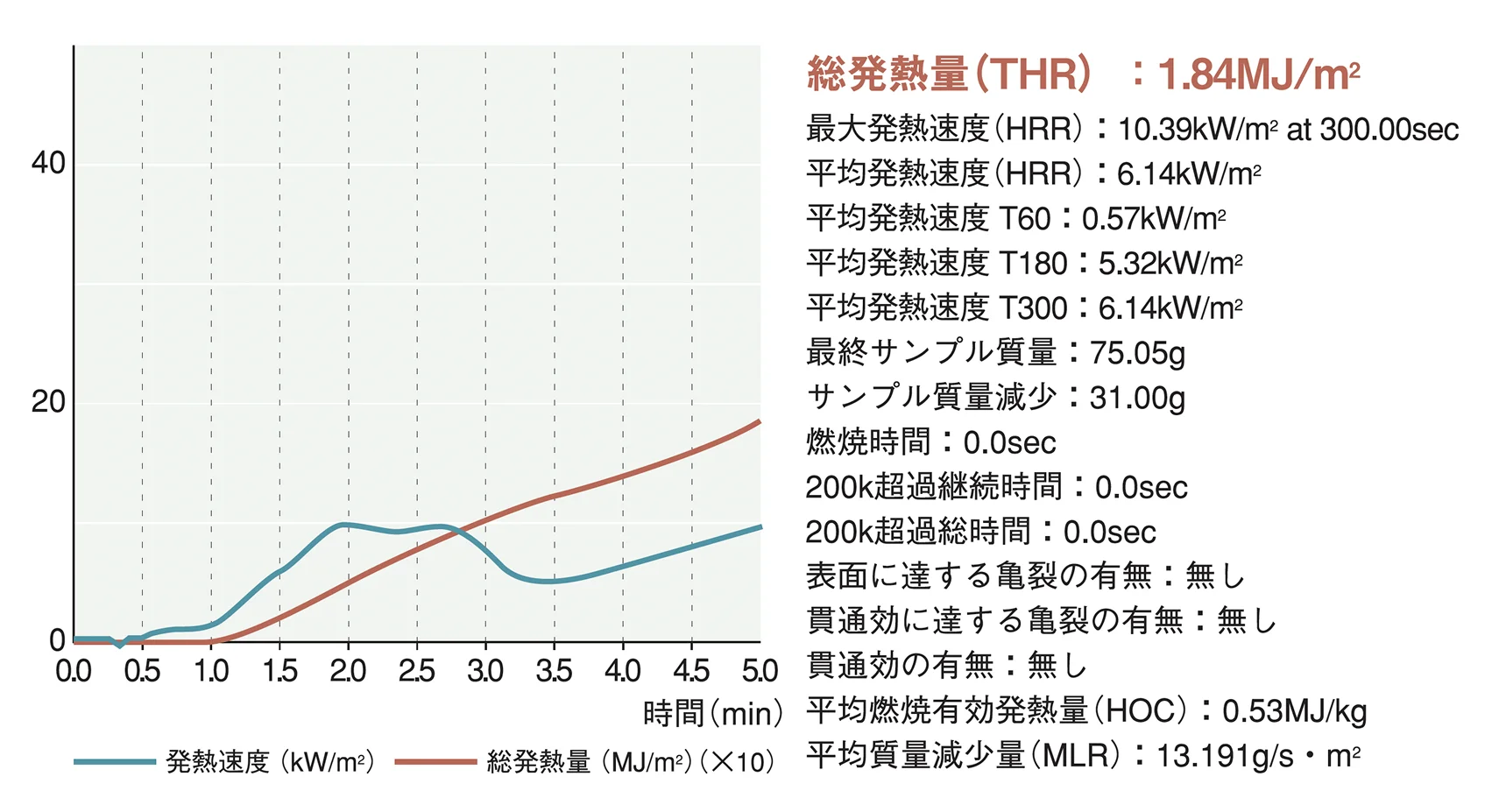 国土交通省が定める難燃指定は、5分間の燃焼試験で総発熱量が8MJ/m²以下ですが、弊社のヨコタケボード竹貼の試験結果は1.8MJ/m²との数値が出ております。