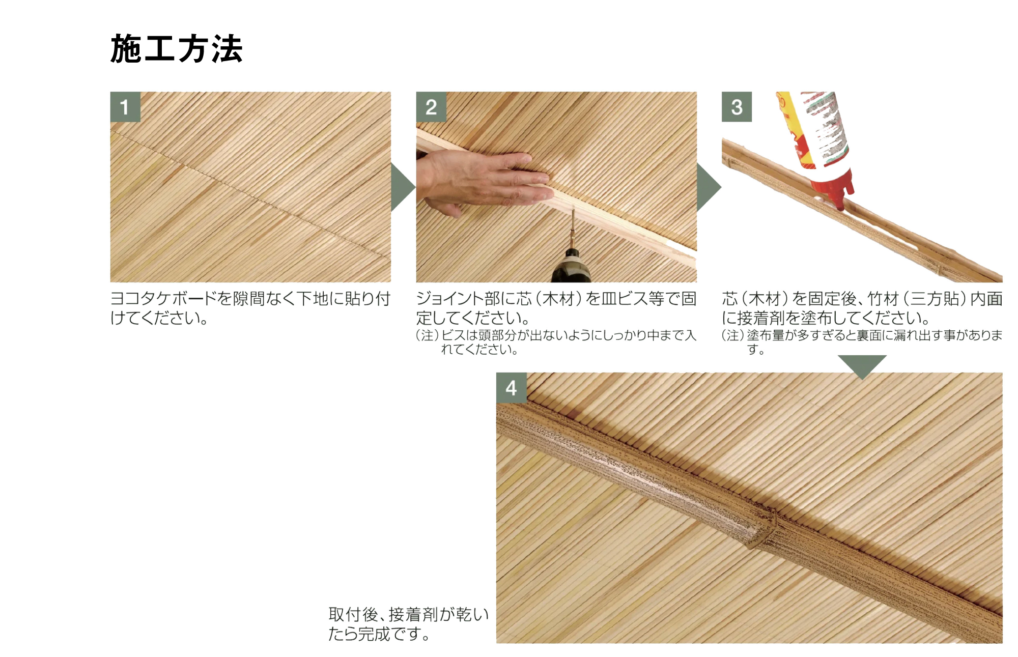 芯の木材と表面の竹材が分離していることにより、ビス跡を残さない、天井表面からの取付けが可能です。