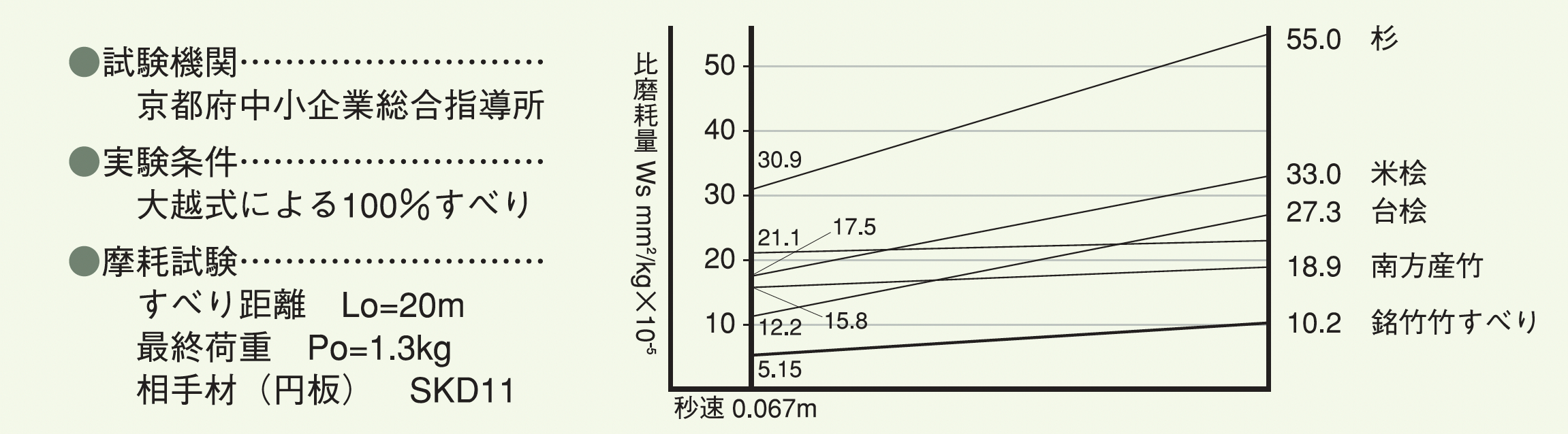 京都産竹すべりの材質は竹の三悪と言われる虫、カビを完全に防ぐため、万全を期して加工しております。虫は伐採時期の厳守プラス高圧釜による高圧加圧高熱処理による人工乾燥を行っています。別表に示す通り耐摩耗性の差は歴然としております。