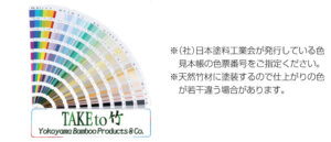 この竹材は、真竹の表皮部分をサンドブラスト加工した表面に塗料を施したものです。塗装には耐候性ウレタン塗料を使用しており、紫外線やキズに強い仕様となっています。さらに、食品衛生法の規格基準も満たしているため、安心してご使用いただけます。