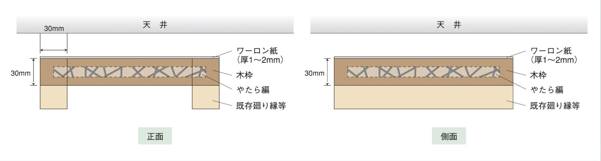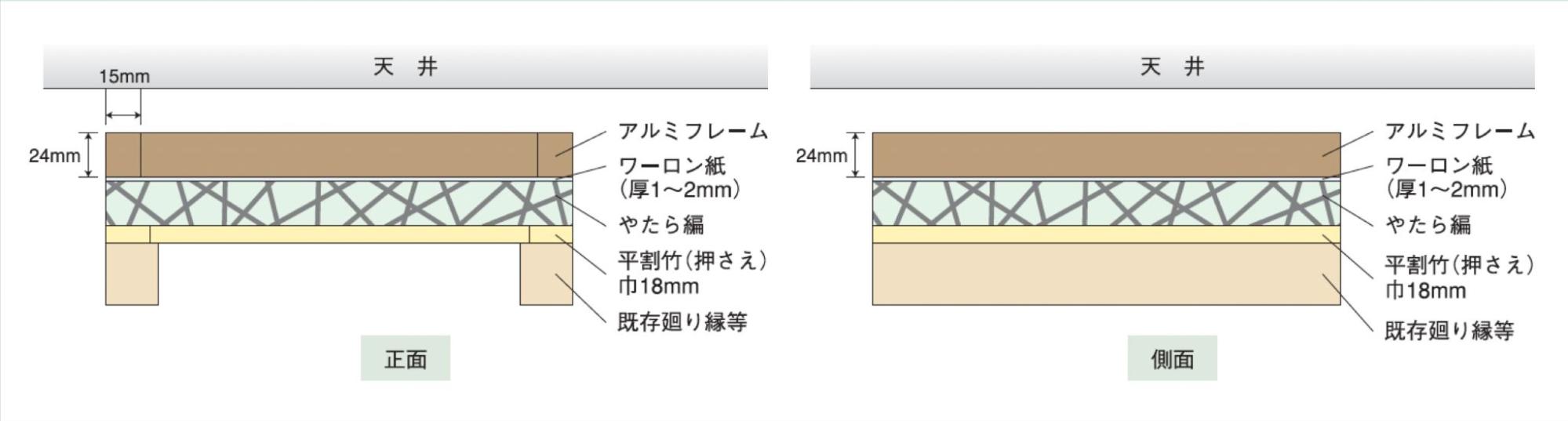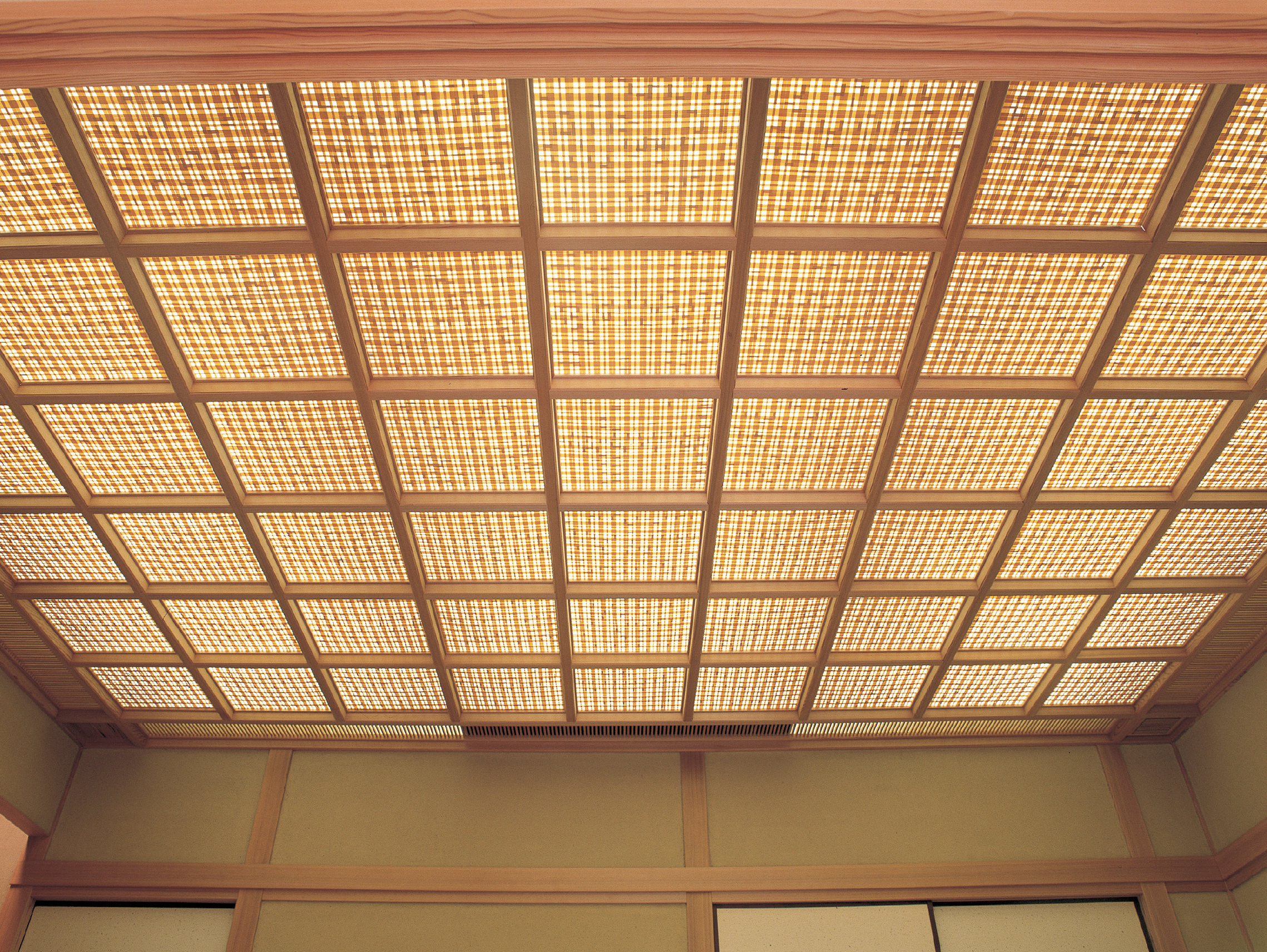 天井面全体を光源に見せる照明方法を光天井。天井全体を乳白色のプラスチックパネルやガラスまたはルーバーなどで覆い、その中に照明器具を設置し、光を拡散透過させることにより天井全体が光源であるように見せる技法です。竹で組んだ光天井で高級感を演出します。